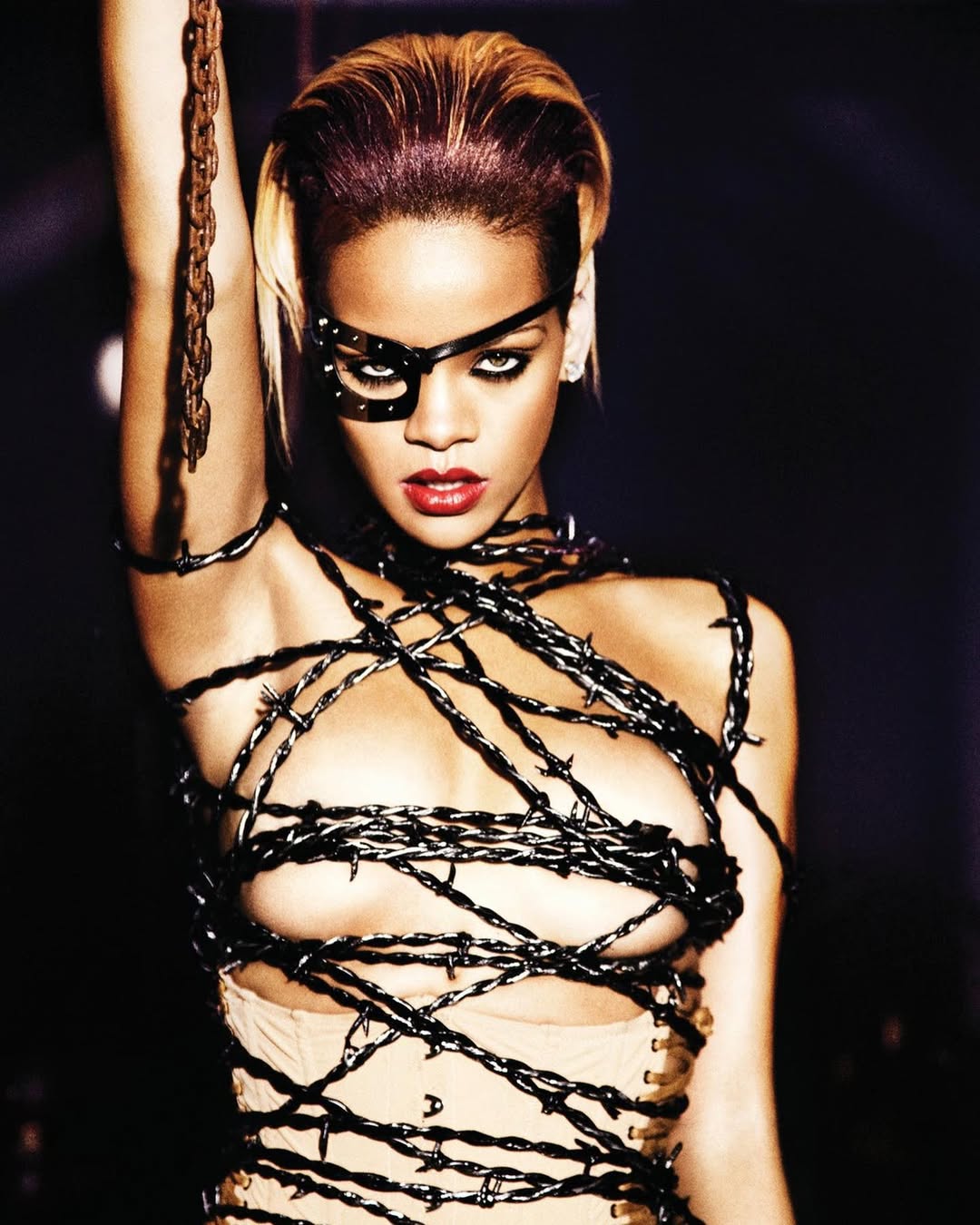 The visual language of Rated R leaned into severity. Straps crossed the torso like deliberate lines of defence. Gloss caught light without inviting it. The styling was minimal, almost militant. Rihanna moved less fluidly in this era. Her posture hardened. Her expressions sharpened.